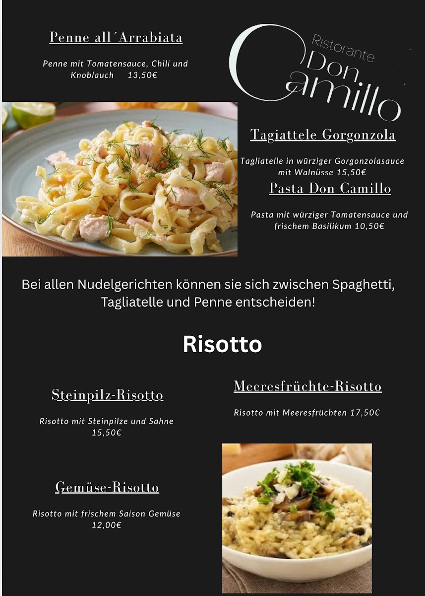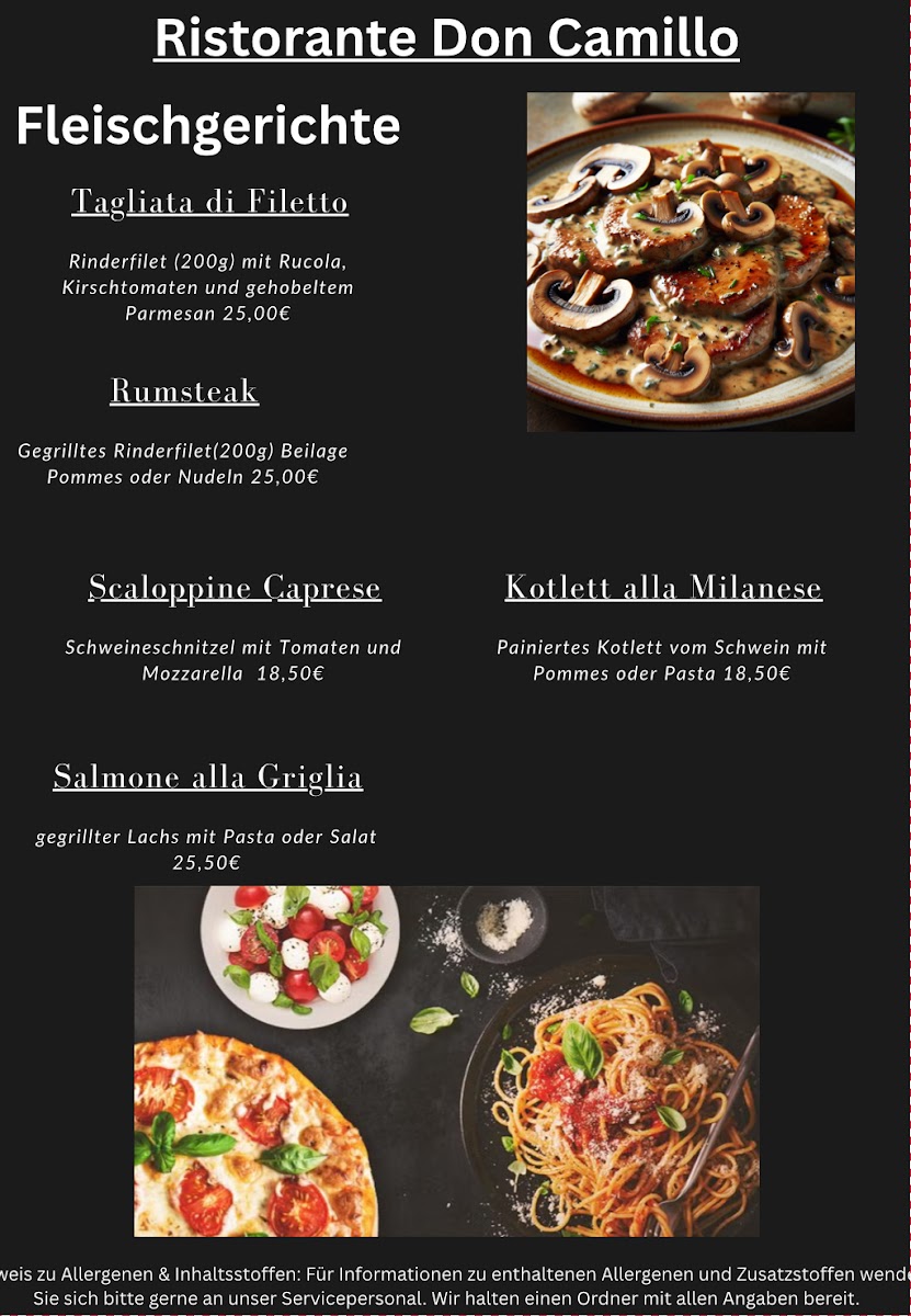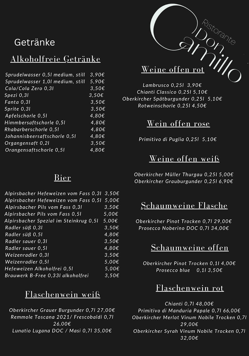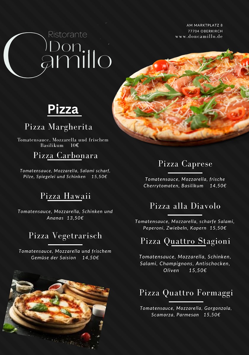 If you're in Oberkirch and craving authentic Italian flavors, the Ristorante-Pizzeria Don Camillo Oberkirch Menu is the place to be. Located at Am Marktpl. 8, this charming spot brings the heart of Italy right to the center of the town. The menu offers an irresistible mix of traditional dishes, from wood-fired pizzas to homemade pastas that taste like they were crafted straight from Nonna’s kitchen. Whether you're in the mood for a classic Margherita pizza, a rich plate of lasagna, or a fresh seafood dish, there’s something for every taste. Each bite is a true celebration of Italian cuisine, featuring only the freshest ingredients. And don't forget the carefully selected wines, perfectly paired with each dish to elevate your dining experience. The cozy yet vibrant atmosphere makes it ideal for a casual meal with friends or a special family gathering. You'll find that each dish is made with love, giving you a taste of Italy without having to leave the town.